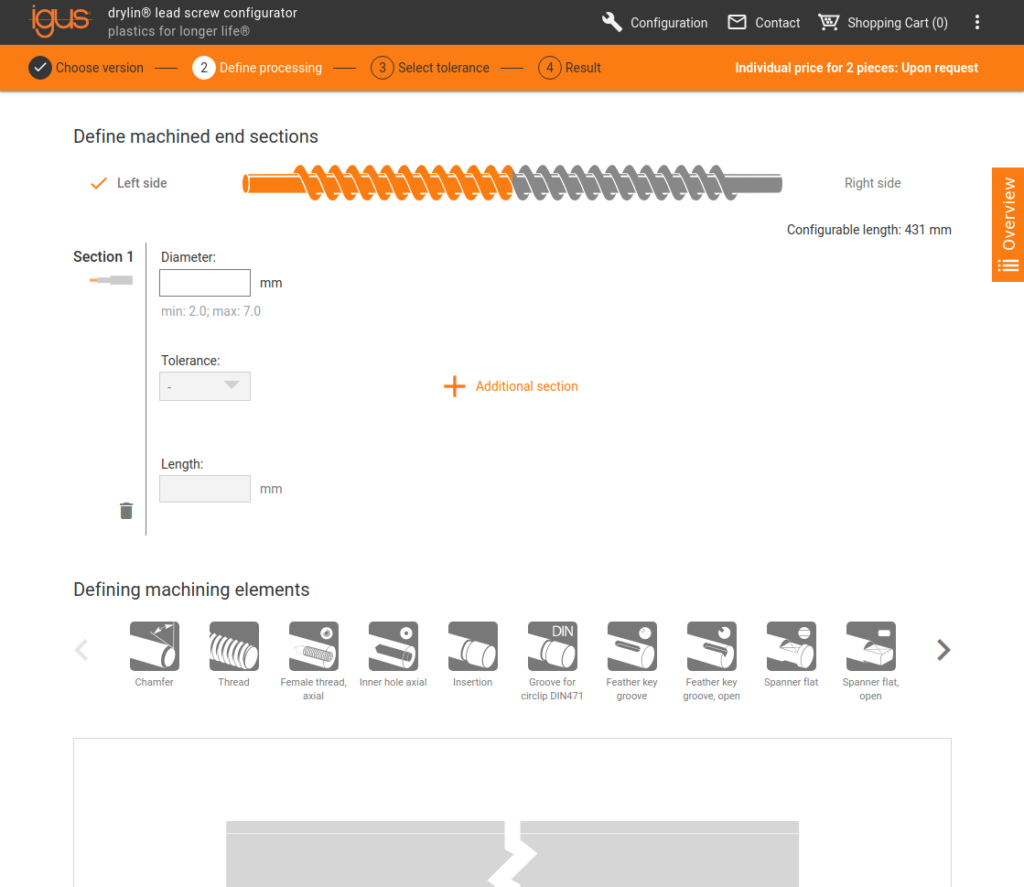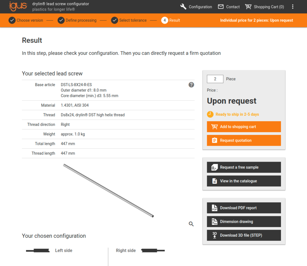 Umożliwia klientom szybkie i łatwe zamawianie śrub pociągowych. Skraca niezbędny czas zamawiania z 2 tygodni do 20 minut lub mniej.