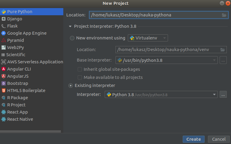 Po lewej stronie zostaw „Pure Python”, w „Location” wybierz gdzie ma zostać stworzony folder z projektem – ja sobie stworzę go na pulpicie (Desktop) o nazwie „nauka-pythona”.