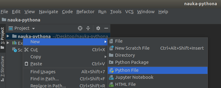 Teraz w prawym górnym rogu, kliknij prawym klawiszem na swój nowy folder, wybierz „New”, a następnie „Python File”. Wpisz dowolną nazwę pliku – ja go u siebie nazwę „app”.
