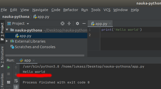 Tadam! Gratulacje! Twój program wypisał właśnie w terminalu tekst „Hello world”! Może rozpierać Cię duma, zdaje się, że to w sumie jeszcze niewiele, ale już niedługo nauczymy się robić dużo więcej 🙂
