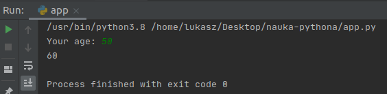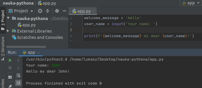 Wartości naszych zmiennych możemy ustawiać przed uruchomieniem naszego programu – tak jak na poprzedniej lekcji lub możemy poprosić Użytkownika, aby je wpisał w trakcie jego działania. Aby to zrobić, należy wpisać = input() obok nazwy naszej zmiennej. W środku nawiasu możemy dodać opis, który będzie mówił o tym, czego oczekujemy od Użytkownika, jednak jest on zupełnie opcjonalny.