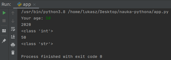 Jest to ok, ale czasami chcemy pobrać dane liczbowe na przykład wzrost, wagę czy cokolwiek innego. Skoro nasza zmienna domyślnie będzie stringiem, to będziemy mogli wykonywać na niej operacje dla stringów, a nie dla liczb. Czyli nie wykonamy, żadnych potęg, dzieleń itd. Aby się upewnić, możemy sprawdzić każdą zmienną jakiego jest typu, aby to zrobić piszemy type(), a w nawiasie powinna być nazwa zmiennej.