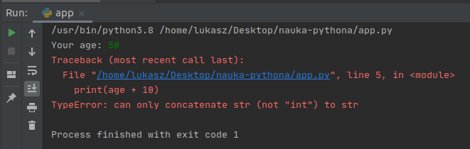 Mimo, że wpisałem 50, to moja faktyczna wartość w zmiennej to ’50’. Teraz gdybym chciał wykonać jakieś działania na liczbach, nie będzie to możliwe.